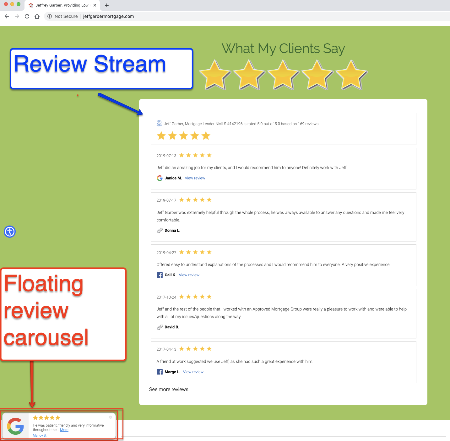 When you get a review, whether it is a direct review or a review that has been left on Google and/or Facebook, your Reputation Automation system will aggregate that review and feature that review on your LeadSite website in multiple places.